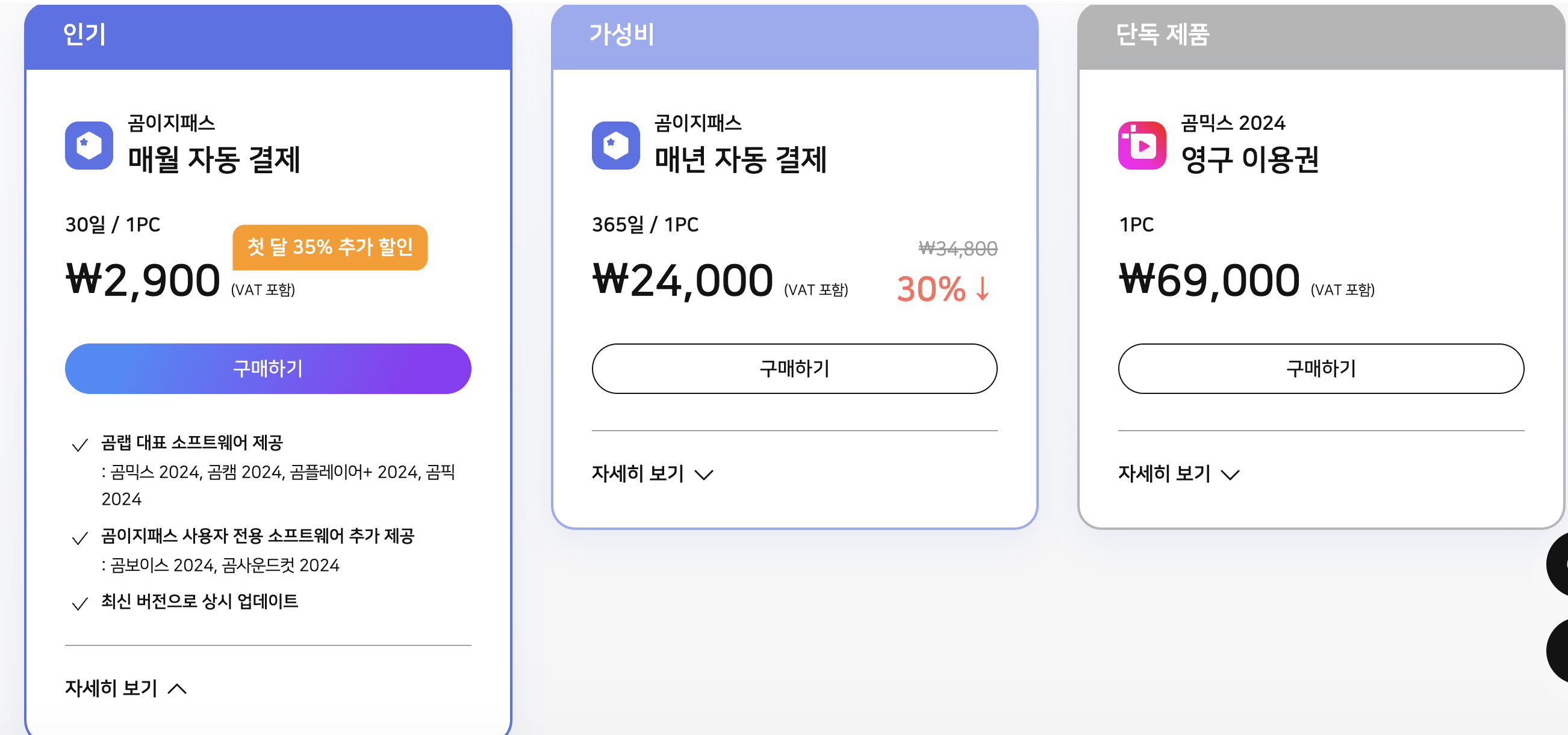 - 포함 소프트웨어: 곰믹스 2024, 곰 캠 2024, 곰플레이어+ 2024, 곰픽 2024